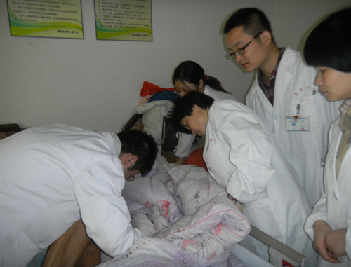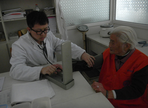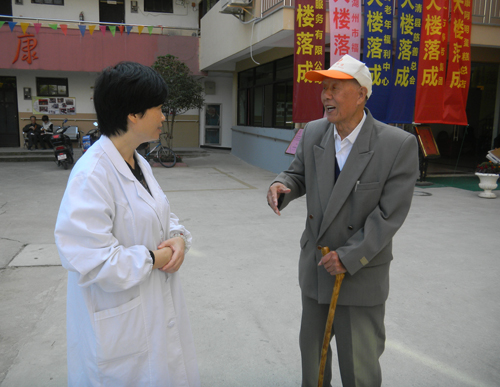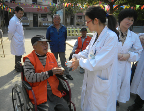 慰问队分成两组,一组走访看望行动不便,长期卧床的老人,并对长期卧床老人的褥疮预防及治疗提出指导建议,对有需要的老人们提供免费的药品;另一组为等候的老人们测量血压,体格检查,耐心为老人们解答咨询。看着老人满是皱纹的脸上露出灿烂的笑容,大家的心里感动一丝丝的甜蜜。