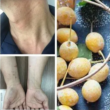 新摘的白果要去皮,前些日子,老陈就在水池里把白果的皮搓去,去皮的过程中他还闻到果皮的一种特殊的“臭味”。次日,老陈的双手、面部起了很多红斑和丘疹,瘙痒难耐,苦不堪言。赶紧前往医院就诊。
