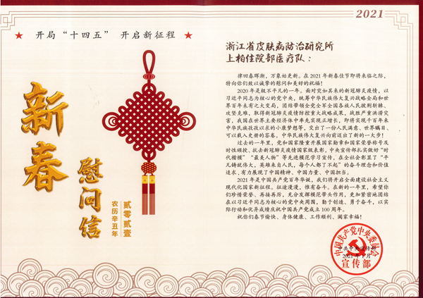 在2021年新春佳节来临之际,中宣部再次向荣获“时代楷模”光荣称号的上柏住院部医疗队,发来了新春慰问信。这是继2019年后,我院收到的第三封沉甸甸的问候。 征途漫漫,惟有奋斗。中宣部向我院先进医疗队致以诚..