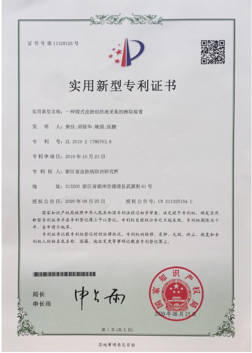 日前,省皮肤病医院喜获国家知识产权局颁发的一项实用新型专利证书,专利名称为“一种钳式皮肤组织液采集的揪取装置”。 该项专利提供了一种新型的揪取装置,操作时不与患者皮肤直接接触,分手操作,安全可靠,有效解决了..